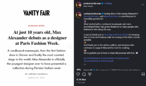 Max Alexander is only 10 years old yet he has managed to do something that most adults can only dream of doing. He was the youngest designer who presented a collection at the Paris Fashion Week. His performance was on March 3 in the renowned Palais Garnier just a few days after his 10th birthday.