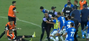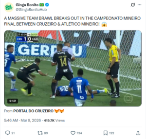 The victory gave Cruzeiro their first Minas Gerais state title since 2019. According to a video, tension suddenly rose in the final seconds of the match. Players began arguing near the penalty area, and the situation quickly turned into a major confrontation that shocked fans inside the stadium.
