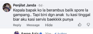 According to Aaron, the individual left a comment telling him to “go back to Singapore” and made a sexually suggestive remark involving his wife, language he described as deeply offensive and unacceptable.