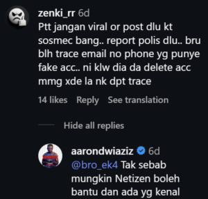 Another netizen advised against immediately making the issue viral. The commenter suggested filing a report first, noting that fake accounts without real contact details can be difficult to trace once deleted. Aaron, however, felt public attention could help identify the person behind the account if someone recognised them.