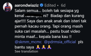 In his post, Aaron tagged both the Malaysian Communications and Multimedia Commission (MCMC) and the Royal Malaysia Police (PDRM), urging authorities to look into the matter.