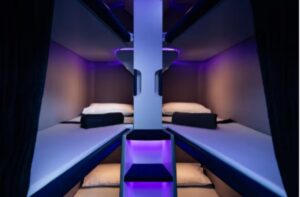 Each Skynest includes six separate sleeping spaces arranged like bunk beds. Every pod comes with a mattress, clean bedding, a privacy curtain, and a seat belt. There are also reading lights, charging ports, and a small amenity kit for personal use.