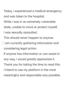 She described the experience as deeply disturbing and said it should never happen to anyone, especially in a situation where help is expected and trust is given.