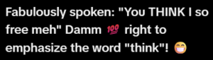 “Fabulously spoken: ‘You THINK I so free meh’ Damn 💯 right to emphasize the word ‘think’!”
