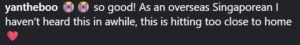 “So good! As an overseas Singaporean I haven’t heard this in awhile, this is hitting too close to home ❤️”