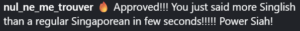 “Approved!!! You just said more Singlish than a regular Singaporean in few seconds!!!!! Power siah!”