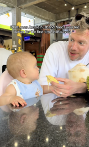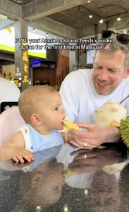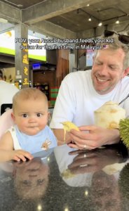 The family recently visited Malaysia. And it is suspected from the video that baby’s mom is Malaysian. They are enjoying the local food and culture here. The father is especially enthusiastic about introducing the child to new tastes. So durian was not left out. They captured the moments on camera for memories.