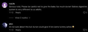 However, many warned that feeding too much durian to children can cause digestive problems. Others expressed concern that durian can be “too hot” for children.