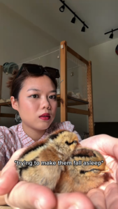 A clip showed him holding the last chick, visibly sweating from the effort.