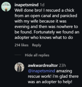 “Well done bro! I rescued a chick from an open canal and panicked with my wife because it was evening and then was nowhere to be found. Fortunately we found an adopter who knows what to do”