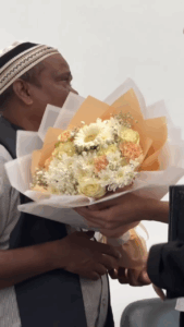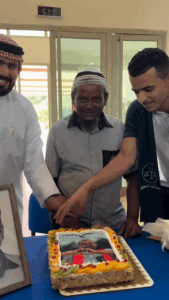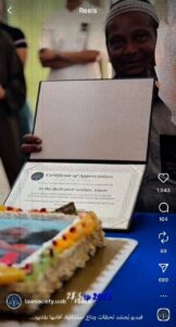 They present him with a bouquet of flowers as students clapped. They then took him to cut a cake decorated with his face and the words “I love you Islam.”