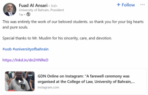 University of Bahrain President Dr. Fuad Mohammed Al-Ansari also recognised the gesture in a LinkedIn post, commending the students for their compassion.