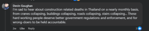 The emergency medical team from Ramathibodi Hospital could only confirm that he had died at the scene. Sarawut, an electrician, had been working on the project for several months.