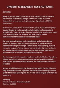 Bangladeshi transgender activist and artist Sahara Chowdhury Rebel began a hunger strike near Dhaka University on 10 October, demanding legal recognition of marriage rights for LGBTQ citizens in Bangladesh.
