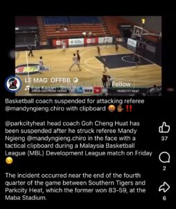 Head coach of Malaysia’s Parkcity Heat has been suspended after hitting referee Mandy Ngeing in the face with a tactical clipboard, The incident took place on 24 October during a Malaysia Basketball League (MBL) Development League match. The game, held at Maba Stadium, ended with the Southern Tigers beating Parkcity Heat 83-59.