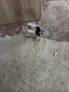 Later in the video, one of the birds is seen coming towards a corner against a wall. The note is clung to its body and perhaps held by its beak or feet. The other bird also flies in a similar manner and carries the object along. The notes seem to be genuine money, but the origin is not specified in the video. The setting resembles a bare yard with rocky terrain and some rocks. No other individuals can be seen in the clip. This helps keep the emphasis on the birds and their strange behavior.