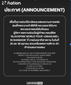 “In observance of, and to demonstrate our deep respect for Her Majesty Queen Sirikit The Queen Mother, we kindly ask all attendees of the ‘BLACKPINK WORLD TOUR <DEADLINE> IN BANGKOK’ concerts at Rajamangala Stadium on 25 and 26 October to wear black or white attire as a mark of mourning and respect.”