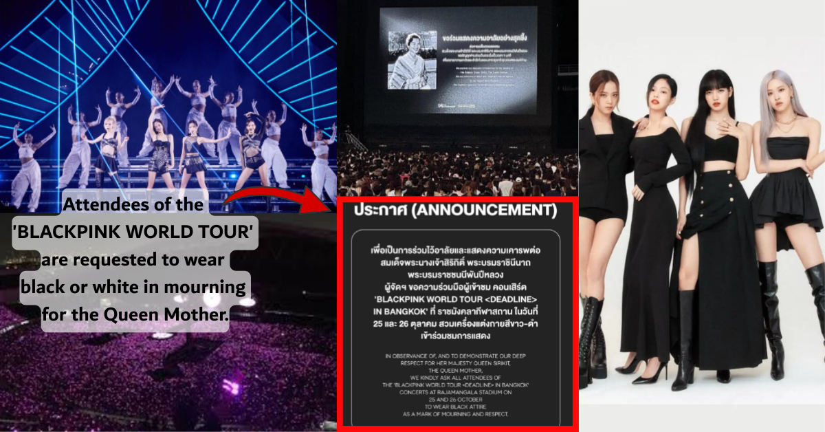 “In observance of, and to demonstrate our deep respect for Her Majesty Queen Sirikit The Queen Mother, we kindly ask all attendees of the ‘BLACKPINK WORLD TOUR <DEADLINE> IN BANGKOK’ concerts at Rajamangala Stadium on 25 and 26 October to wear black or white attire as a mark of mourning and respect.”