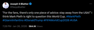 Blatter gave his opinion X, in which he defended some statements given previously by the Swiss anti-corruption expert and lawyer Mark Pieth. In his post, Blatter has cited the advice of Pieth to the fans to avoid the United States and replied that the World Cup should be questioned in the current circumstances.