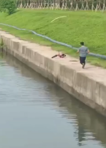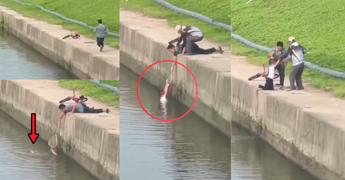 A nearby man noticed the emergency and rushed to help. He understood the risk and chose not to jump into the canal. Instead, he used a long-handled fishing net to reach the boy from above. Lying flat on the edge, he stretched his body forward and lowered the net carefully.