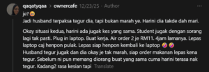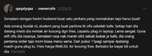 She also shared that the student asked for plain water, which was provided for free. The student used the shop’s WiFi and charging ports throughout his stay while working on his laptop.