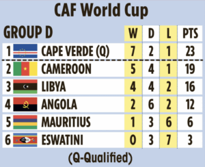 Cape Verde topped Group D with 23 points, four more than Cameroon, one of Africa’s top World Cup teams. Cameroon previously held an African record of eight World Cup appearances.
