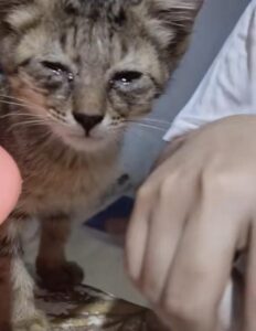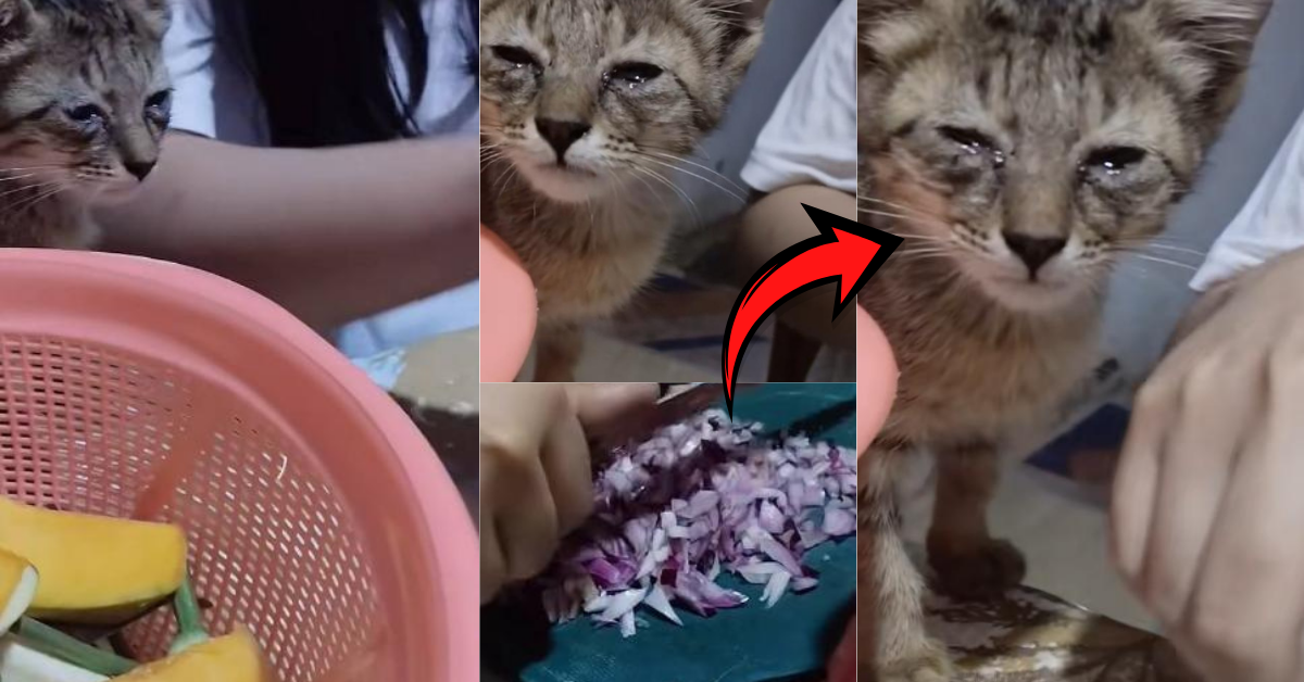 A small cat was seen tearing up while sitting near its owner during a cooking session. The moment, captured in a short video, shows the animal standing quietly on a table as onions are being chopped nearby.