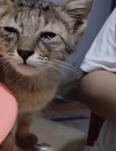 The unusual scene quickly draws attention because the cat appears to have watery eyes. While the owner continues preparing food, the cat stays close, blinking slowly and looking uncomfortable.