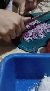 In the video, someone is chopping red onions on a green chopping board. The setting appears simple, with basic kitchen tools and a calm environment. The cat is standing beside the cutting area and is observing the process without shifting. The chopping keeps on, and its eyes start to water. The cat does not seem to be panicking but instead stands still with its eyes being shut every now and then. This gives an impression that it is responding to the odorous smell emitted by the onions.