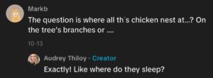 Others were more puzzled: “Where do the chickens sleep?” Audrey herself replied, “Exactly! Like, where do they sleep?”