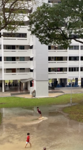 The video shows children running, splashing and playing in the water in their own way. The rows of HDB blocks and green grass fields around them make the whole scene more lively. The shallow water that has accumulated after the rain has become a small playground for them.