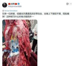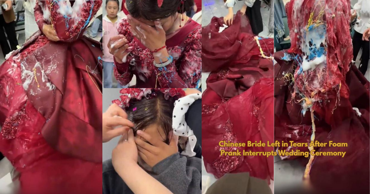 A Chinese wedding was shaken into an unexpected twist when the bride was put on full view of distress after a prank. What was intended to be a happy day soon turned into a bad one when the bride was enveloped in foam and colored streamers during the ceremony.