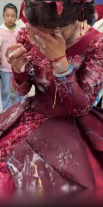 The bride wore a traditional deep red wedding dress, adorned with a lot of beadwork and other accessories. The costume seemed to be well made for the special occasion. But during one time of the celebration when guests tend to mingle with the couple, things went awry in a short time.