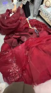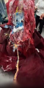 Individuals around intervened to assist her. They attempted to brush off the foam and take the streamers off her dress. Nevertheless, the damage to the gown was evident, despite their efforts. The formerly stylish garment was wet and dishevelled with sticky substances.