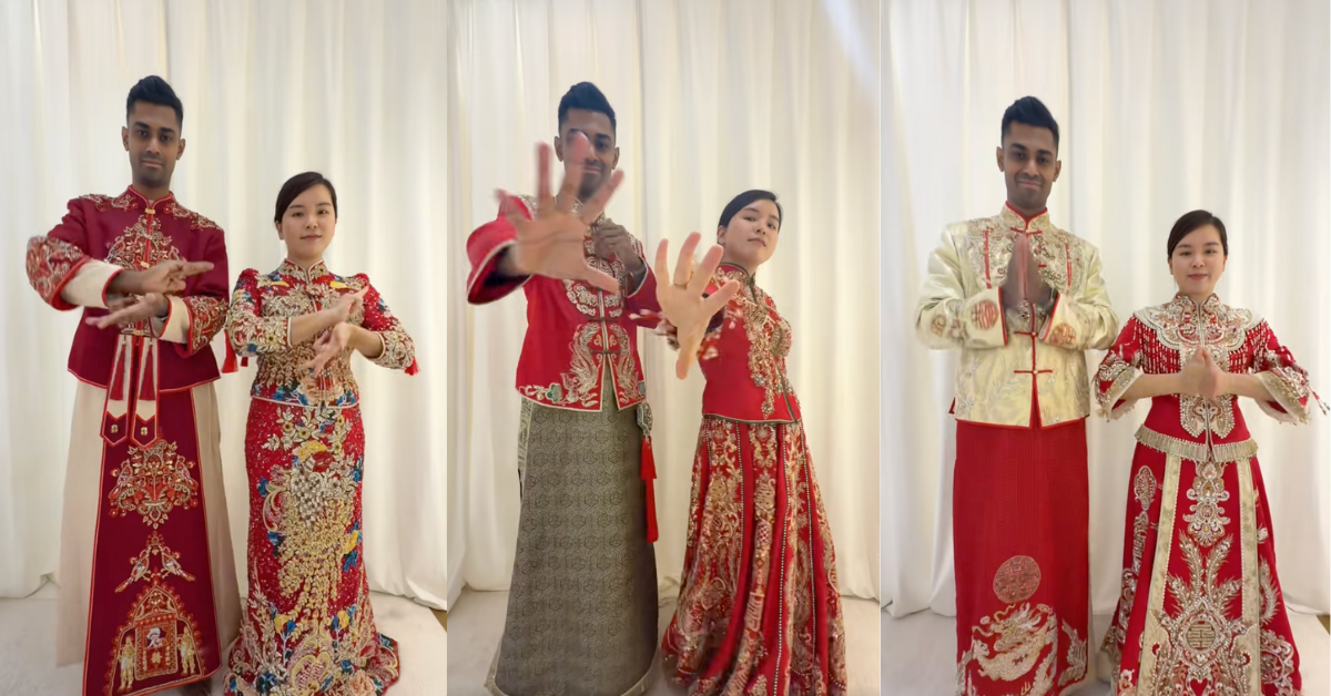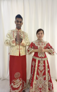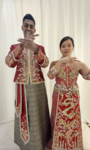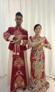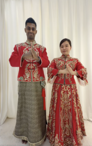 At the beginning of the video, the couple is seen in traditional Chinese clothing, where the abundance of red is evident. In Chinese culture, red is considered a symbol of good luck, joy, and auspicious beginnings. The husband was wearing a half-red jacket with a long panjabi, while the wife was wearing an Indian-style red gown decorated with embroidery and stonework.