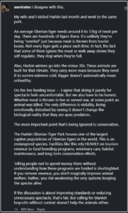 One commenter who said he had visited the park last month argued that the claim of overfeeding may be overstated. An adult Siberian tiger can require around 8 to 12 kilograms of meat per day, he wrote, adding that with hundreds of tigers in the park, not every animal would receive food from tourists each time.