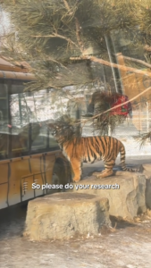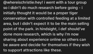 She also highlighted another paid activity — releasing live chickens into the enclosure for the tigers to hunt — which she described as particularly uncomfortable.