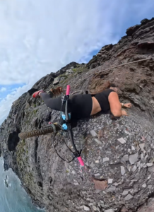 The edge of a cliff is too near as she slides along the unstable surface down the hill. The camera is still capturing the whole situation and how fast the situation changes into a serious one.