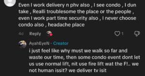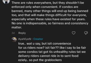 In one TikTok post, a delivery rider criticised condominium policies that prevent riders from riding in to complete deliveries, saying the system makes their lives “difficult” and wastes precious time.