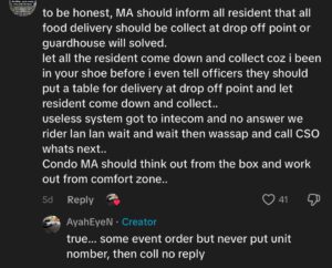 In a follow-up video days later, the same rider suggested that managements of such developments consider installing delivery lockers at drop-off points — similar to those at certain institutions — so residents can collect their own orders.