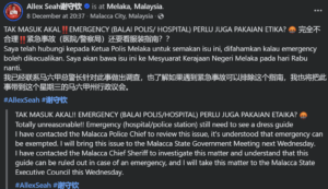 Kesidang assemblyperson and Melaka EXCO member Allex Seah also criticised the enforcement of the dress code at police stations and hospitals.