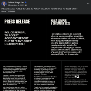 “I am shocked and disappointed by the incident,” he said, noting that Saifuddin had already made clear in 2023 that attire should not prevent police from accepting reports.