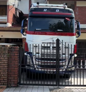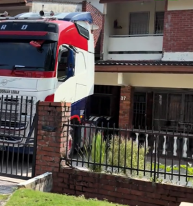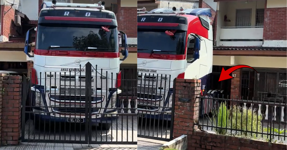 Residents in Ampang, Malaysia, are currently sharing videos of a very unusual sight in their neighborhood. A giant Volvo prime mover truck is parked inside the narrow porch of a standard terrace house. The truck is so large that it almost touches the roof of the building and fills the entire driveway.