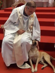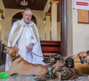 For years, the priest has been rescuing stray dogs, bathing them, feeding them, getting them medical care, and making space for them in his rectory. Many of them sleep under the same roof as him.