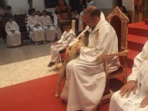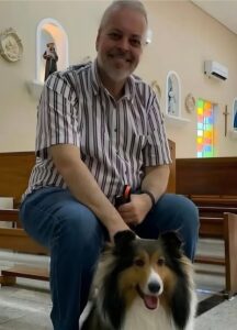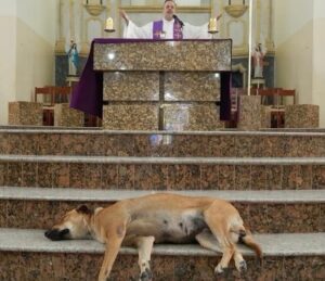 Every Sunday, Father João Paulo brings one of the rescued dogs to Mass. They sit at the front pews, sometimes near the altar, sometimes quietly beside him — and the congregation gets to meet them, pet them, and, often, adopt them.