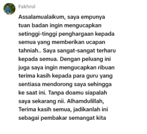 After the video was released, emotional reactions were seen on social media. Fakhrul wrote that he is grateful for everyone’s wishes and will never forget the contribution of teachers.