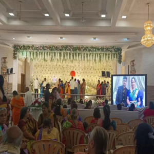 Guests spoke to the couple through the screen, and the programme continued as planned. The screen was placed at the centre of the hall so everyone could see and interact.