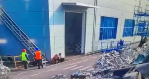 In the footage, the driver appears to lose control, causing the frames to slide off and crash straight onto the two labourers sitting just a few steps away. Nearby staff, shocked by the loud noise, immediately rushed over.