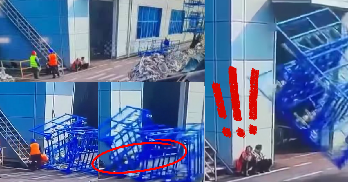 In the footage, the driver appears to lose control, causing the frames to slide off and crash straight onto the two labourers sitting just a few steps away. Nearby staff, shocked by the loud noise, immediately rushed over.
