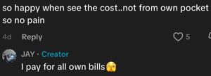 The creator quickly clarified with a lighthearted reply: “I pay for all own bills.”